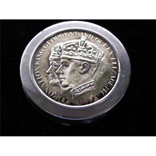 UNIQUE SOUVENIR FROM ROYAL CORONATION:<p>This is a vintage 1937 Royal Coronation Souvenir Compact designed to celebrate the coronation of King George 6th and Queen Elizabeth ( later to be the Queen Mother ). <p>The compact features a relief of the King and Queen in profile in a polished metal with brass underlay for the central relief. Opening: push clasp.<p>Condition is good with light wear, no puff, a little area of wear to the centre of the metal mirror. The compact has a diameter of about 1 inch. The back of the compact reflects minor dents. Closure works fine.<p>Hallmarks are almost worn off: With a loupe the marking reads, Made in England in a half circle. At top of the circle the name of Rachel is inscribed.