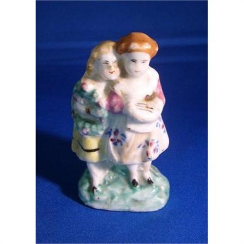 This charming Victorian Staffordshire figure shows two Kate Greenaway style girls with polychrome painted highlights. It is a petite 4 inches in height and is of English origin circa 1880. There are no markings on the bottom, but the piece is in overall excellent condition with no damage or repairs.