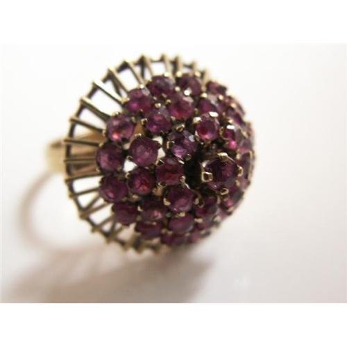 A REAL STUNNER:<p>1940's - 1950's Cocktail Ring. Setting features a three tier ruby gemstone ring with 1 main center stone at top. Open-work basket style setting. Hallmarked 14kt gold. Fine condition from a private estate. Close to 50 individual prong set rubies. A vintage keepsake ring that you will want to pass to your daughter. <p>Measurement: Ring Size: 5 Weight: 4 grams. Base of ring measures 3/4" across. Height of ring from base to center stone) 3/4"