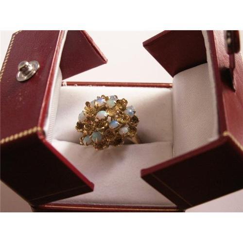 Vintage Estate Ring. European Hallmarked - High style with intricate detailing. Australian Fire Opals (15) surrounded by yellow gold floral leaves in a honeycomb pattern for contrast and definition. European Hallmarked: 585 with stamp (14kt). Circa unknown at this time: Pre 1980's.<p>Measurement: 3/4" round Dome. Height of dome. Just under 3/4". Ring Size: 5.5 - Weight: 7.5 Grams. Ring is capable of being re-sized.