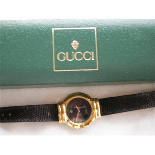 IMAGINE, CLASSIC GUCCI WATCH WITH ORIGINAL CASE. Stunning Black dial with gold hands. Uni-sex style. 5300 M is for men and style 5300 L for ladies. However, this can be worn by either sex because the dial is large but not too large for a women. The casing and back is a yellow gold plated with the designer Gucci logo and markings, 5300M. This is a quartz movement that still runs well and keeps good time. The original black leather band is marked Gucci with a Gucci buckle. <p>Measurement: Size 33 x 37 mm or 1.299" x 1.456"<p>Note: Some of the photos appear to make the face blue but the color is most definitely black.