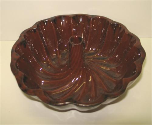 PRIMITIVE REDWARE CAKE MOLD. Has one vertical crack visible along exterior and middle portion shows several small chips. Shows signs of crazing. 2.5" H, 8" Dia.
