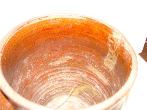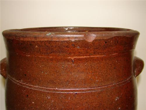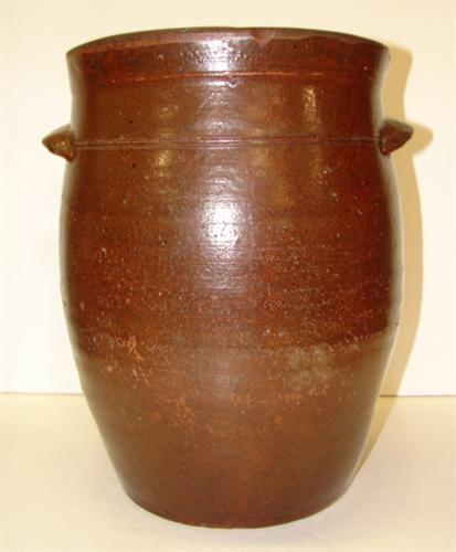 REDWARE OVOID CROCK. Has eared handles. Shows some small chips around inner portion of top rim and on eared handles. 12.25” H