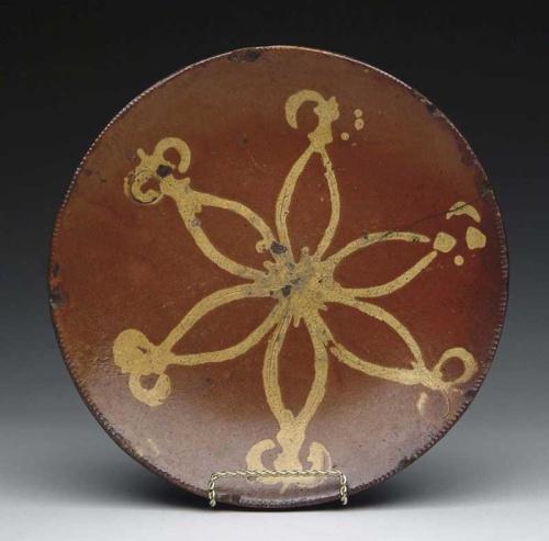 REDWARE SLIP DECORATED PLATE. Shallow plate has crimped edge and yellow six petal star. SIZE: 11”. CONDITION: Crack and some rim chips. 9-27567