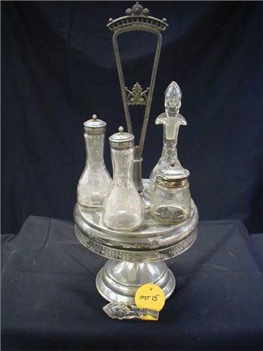 REED & BARTON CASTOR SET 17in #3995 INCLUDES (4) CRUETS W/FLORAL ACID ETCHED DESIGN (MISSING 1 CRUET HAVE TOP) (LARGE CHUNK OF METAL MISSING)
