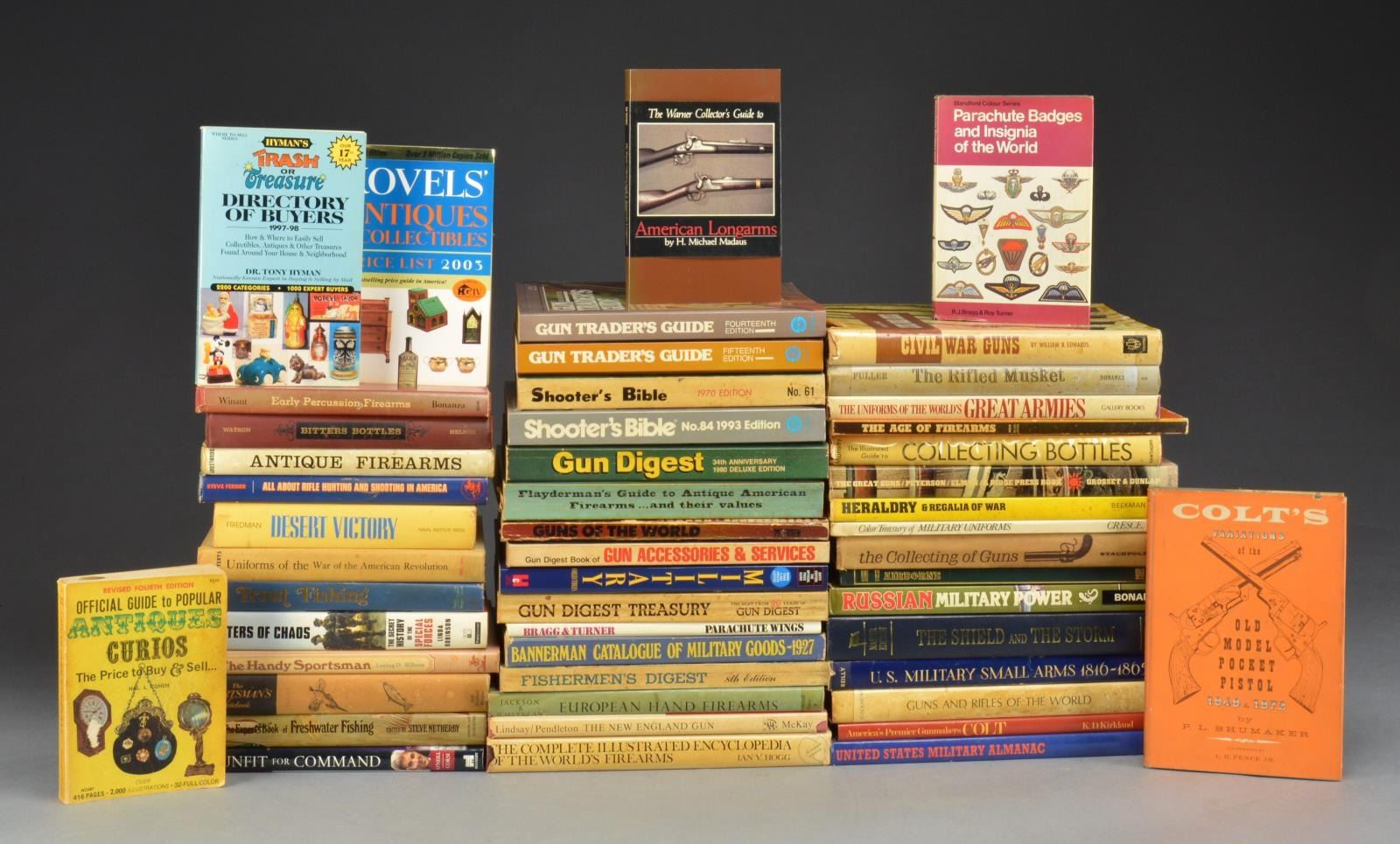 15+ FIREARMS REFERENCE BOOKS.: "United States Military Small Arms 1816-1865" by Robert N Reilly. / " The Rifle Musket" by Claude E. Fuller. / "Civil War Guns" by William B. Edwards. / "Guns & Rifles of the World" by Howard L. Blackmoor. / "Collecting of Guns" edited by James E Serven. / "The Great Guns" by Howard L. Peterson & Robert Elman. / "The New England Gun: The First Two Hundred Years" by Merril Lindsay. / "European Hand Firearms of the 16TH, 17TH & 18TH Centuries" by Herbert J. Jackson. / "The Age of Firearms" by Robert Hell. / "Antique Firearms" by Frederick Wilkinson. / "Early Percussion Firearms" by Lewis Winant. / "Firearms to 1905" The US Cartridge Company collection by Donald B McLean. / "Warner Collector's Guide to American Longarms" by H. Michael Madaus. / "America's Premier Gunmakers, Colt" by K.D. Kirkland. / "Complete Illustrated Encyclopedia of the World's Firearms" by Ian V. Hogg. / "Colt Variations of the Old Model Pocket Pistol 1848-1872" by P.L.Shumaker. / "All About Rifle Hunting and Shooting in America" By Steve Ferber. / 10+SOFTCOVER BOOKS FOR FIREARMS ENTHUSIASTS.: "Shooter Bibles" 1970 & 1993 Editions. / "Guns Digest" 1980. / "Guns Digest Treasury The Best From 20 Years". / "Gun Illustrated" 1977. / "The Gun Collector's Digest". / "Gun Trader's Guide" 14th & 15th editions. / "Home Gunsmithing Digest". / "Shooter's Bible Black Powder Guide". / "Gun Digest Book of Gun Accessories & Services" . / "Gun Digest Book of Exploded Firearms Drawings". / "Flaydermans Guide to Antique American Firearms". / "Gun Traders Guide, Guns of the World". 15+ VARIOUS COLLECTORS GUIDES.: "Uniforms of the World's Great Armies 1700 to the Present" edited by I. T. Schick. / "Color Treasury of Military Uniforms" by Crescent books. / "Uniforms of the War of American Revolution" by Charles M. Lefferts. / "L'Uniforme Et Les Armes Des Soldats Du Premier Empire" French language book by S.A.I le Prince Louis-Napoleon. / "American Socket Bayonets 1717-1873". / "Parachute Badges And Insignia of the World" by R. J. Bragg & Roy Tuner. / "Official Price Guide to Military Collectibles" by Richard J. Austin. / "Heraldry & Regalia of War" by Beekman House. / "Official Guide to Popular Antique Curios" revised 4th edition by Hal L. Cohen. / "Kovels' Antiques & Collectibles price list 2003". / "Collecting Bottles" by Cecil Munsey. / "Bitters Bottles" by Watson & Nelson / "Bottle Collecting Manual with Prices" 1971 by John. F Hotchkiss & Joan H. Cassidy. / "The Official Bottle Price List" by Ralph & Terry Kovel. / "Bottle Collector's Handbook & Pricing Guide" by John T. Yount. / " Price Supplement to The Antique Bottle Collector" by Grace Kendrick. / "1200 Bottles Priced" by John C. Tibbitts. / "Tri-State Bottles" By Walter E. McConnell. / "Hyman's Trash or Treasure directory of Buyers 1997-98". / 10 MILITARY HISTORY & POLITICAL BOOKS.: "United States Military Almanac" by Walt Land. / "Parachute Winds" by Bragg & Turner. / "The Airborne" edited by Ashley Brown & Jonathan Reed. / "The Shield And the Storm United States Coast Guard" by Thomas G Blake. / "Russian Military Power" by Bonanza Books. / "Masters of Chaos" by Linda Robinson. / "Desert Victory the War for Kuwait" by Noman Friedman. / "The Fifteen Decisive Battles " by E. S. Creasy. / "Reserve Forces almanac 1988" published by Lee E. Sharff. / "Unfit for Command / John Kerry" by John E' O'Neill and Jerome R. Corsi. / 5+ OUTDOOR SPORTS & FISHING BOOKS.: "The Handy Sportsman" by Loring D. Wilson. / "Fisherman's Digest" 8th Edition edited by Erwin A Bauer. / "Trout Fishing" an outdoor life book. / "The Expert's book of Freshwater Fishing " by Steve Netherby. / "The Sportsman's Notebook" by H.G. Tapply. / "Inland Fisheries & Wildlife Laws" 23rd Edition. / "7 Lesson Rifle Shooting Course" by Jack O'Connor. / Aqua-Field Bowhunting Guide 1979-180. 15+ FIREARMS SUPPLIERS & MFG. CATALOGS.: "Bannerman Catalogue of Military Good 1927". Replica edition by DBI Books. / 6 Dixie Gun Works Catalogs: No. 123, 125, 129, 131A, 135, 136. / Buckeye Sports Supply catalog Vol. 78F. / Savage Arms catalog not dated. / Hopkins & Allen Arms 1982 catalog. / Thompson / Center Arms Catalog No. 12. / CVA Muzzleloading 1978 catalog. / Navy Arms Co. 1982 catalog. / Replica Models Inc. catalog 1973. / Navy Arms Muzzleloaders Annual 1982. / Remington Arms 1985 catalog. / S&S Firearms 1996-1997 catalog of Military Americana. / World Wide Arms limited catalog undated. / Brookstone hard to fine tools catalog Spring 1982./ ASSORTED BOOKLETS, MANUALS & MAGAZINES.: "Delta Manuals" 1990 edition. / Commandant's Bulletin 1985. / Banking & Personal Money management. 1989 by Maine Bureau of Banking. / A 81mm Mortar manual Dec. 1976. / Maine Department of Inland Fishes and Wildlife Research & management report 1994. / Lynchburg Hardware & general store catalog. / "Farmers Almanac" 1989 & 2004. / American Rifleman Magazine 56 Issues Jan. 1968-Oct. 1979. / National Wildlife Magazine Feb.-March 1979. / Early American Life magazine 13 issues June 1976 - April 1981. / CONDITION: fair to very good unless otherwise noted. (02-14027/DS). $300-600.