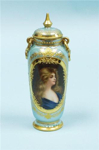 REFLEXION - An antique Old Vienna porcelain miniature covered urn. Of columnar form, with a pair of applied handles. The pale green ground hand painted with extensive relief gilt scroll designs surrounding a a medallion portrait of a young beauty. Hallmarked, titled and numbered.