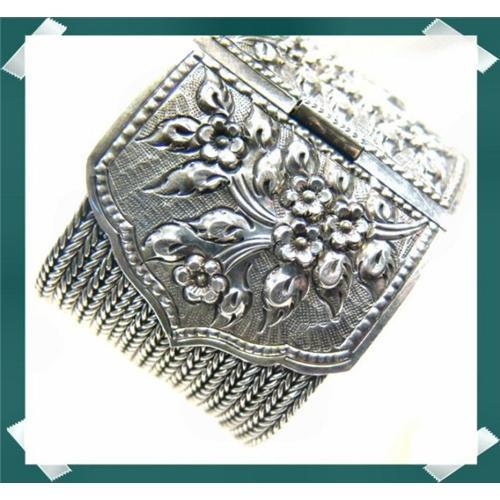Fashioned by the best of professional craftsman this Thailand Flower latch bracelet provides the ultimate in comfort and beauty. Hallmarked 925 sterling this magnificent bracelet has a height of 42mm...Yes, that is approximately 1.78" with an incredible gram weight of 153. The design is phenomenal for the artist has chosen to construct the bracelet of 13 strand of 3mm sterling chain. <p>
