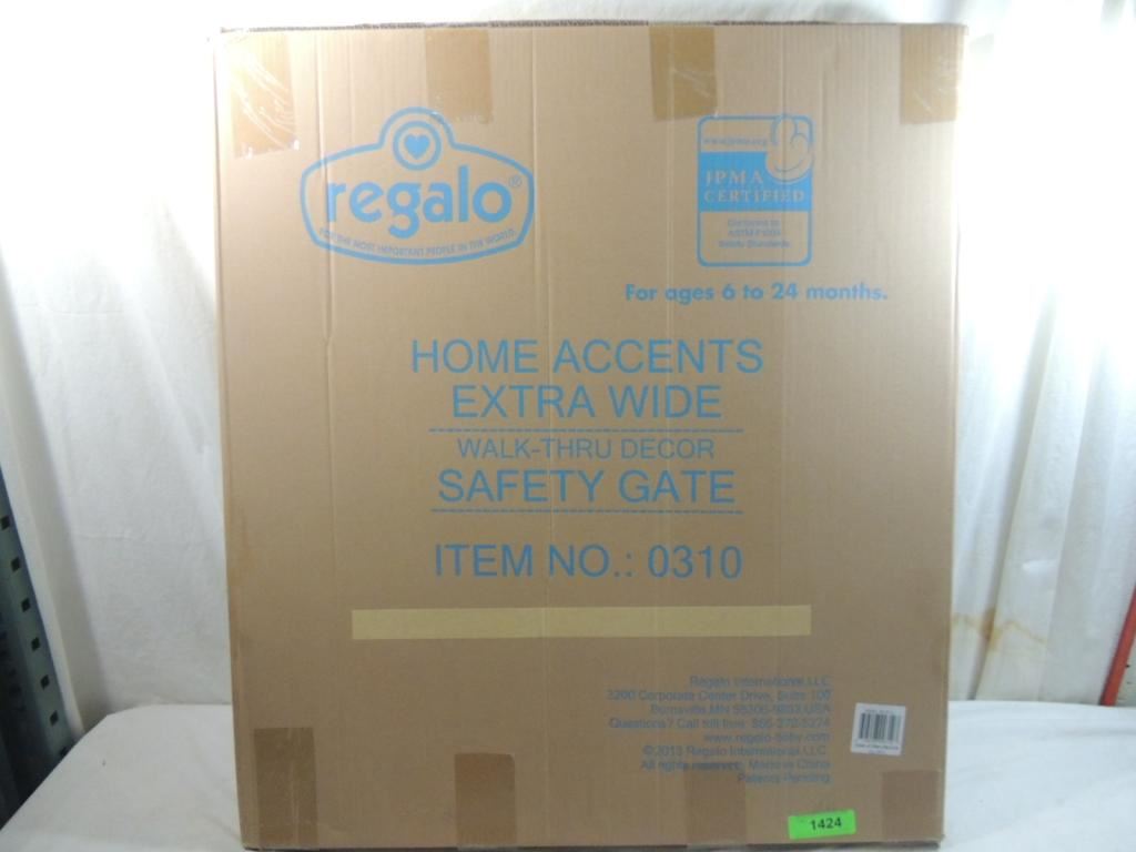 REGALO HOME ACCENTS EXTRA WIDE WALK THRU DECOR SAFETY GATE AGES 6 TO 24 MONTHS SAFETY PROOF, BABY GATE, ANIMAL GATE, TODDLER GATE, NEW IN BOX, HOME DECOR, HOME IMPROVEMENT AS SHOWN SEE PHOTO FOR MORE DETAILS.