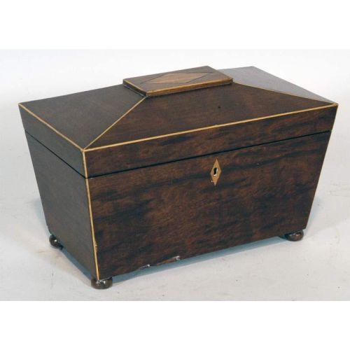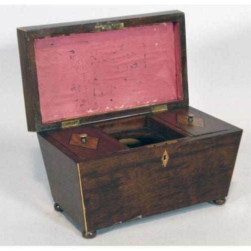 REGENCY INLAID TEA CADDY, 12" long, fitted, CONDITION REPORT: 2" veneer crack, lacking mixing bowl. PACKING AND SHIPPING: We offer packing (double boxed in most cases) and shipping of this item within the Continental United States by USPS or UPS (our choice- boxes over 30lbs or oversized may be recalculated based on buyer's location), NOT INCLUDING INSURANCE (it will be added when we know the sales price) for $20