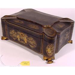REGENCY LACQUERED AND GILDED SHAPED AND SLIGHTLY DOMED WRITING BOX WITH INTERIOR TRAY, circa 1820; 12 inch length; 8-1/4 inch depth; 5 inch height