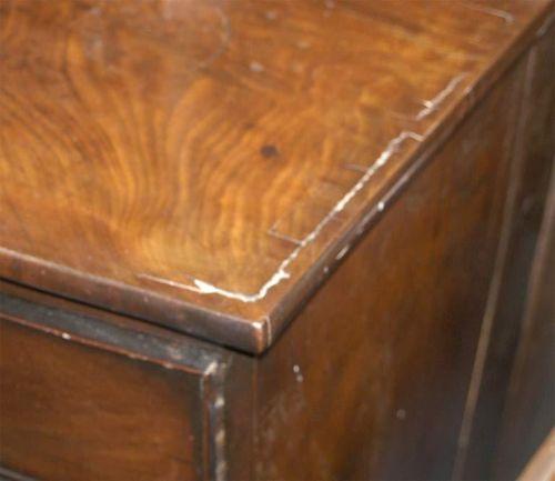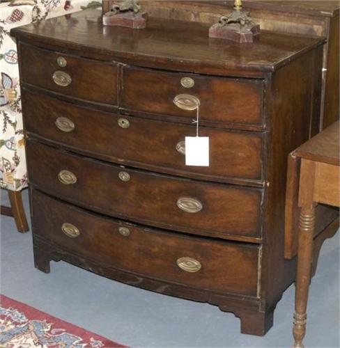 REGENCY MAHOGANY BOW FRONT CHEST, 41" wide, 38" high, 21" deep, circa 1810,, CONDITION: shrinkage splits at edge of top, veneer chips and minor other losses, bottom drawer ill fitting due to shrinkage.