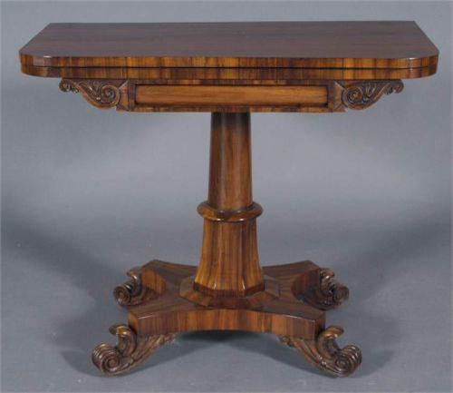 REGENCY MAHOGANY CARD TABLE, 36" wide, 30" high, 18" deep, circa 1820, condition: excellent with two pieces of edge veneer missing. estimate 800-1200