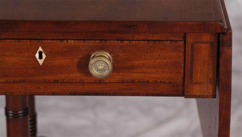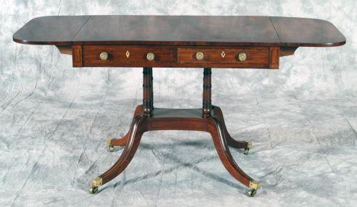 REGENCY MAHOGANY SOFA TABLE, with crossbanding, 35"x24"x28" high, 56 1/2" wide when open, early 19th century, condition: very good with 5/8" strip laid into top to counter shrinkage, SHIPPING: See recommended third party shippers. This item can't be pa