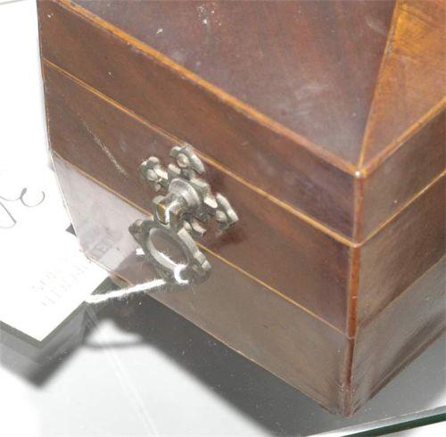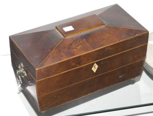 REGENCY MAHOGANY TEA CADDY, with two fitted compartments, handles are Victorian replacements, 11 1/2", circa 1810,, CONDITION: good with replaced handles, no mixing bowl, PACKING AND SHIPPING BY FAIRFIELD AUCTION WITHIN CONTINENTAL USA (excluding insurance) $30