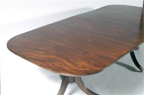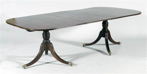 REGENCY MAHOGANY TWIN PEDESTAL DINING TABLE top 45"x68" with 24" leaf, 27 1/2" high, CONDITION: minor seam separations, otherwise excellent,