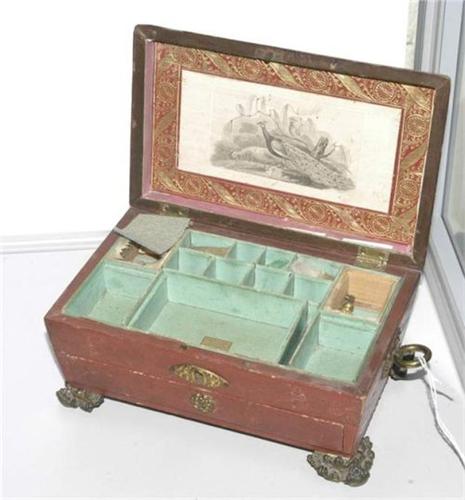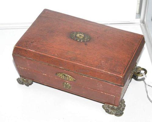 REGENCY RED LEATHER JEWELRY BOX, circa 1810,, CONDITION: scotch tape left on, PACKING AND SHIPPING BY FAIRFIELD AUCTION WITHIN CONTINENTAL USA (excluding insurance) $20