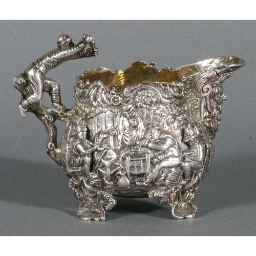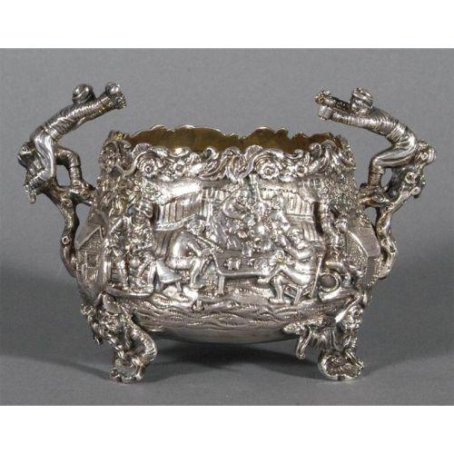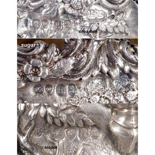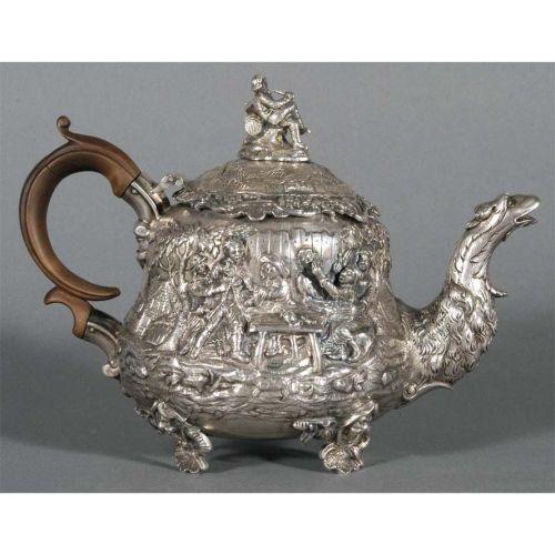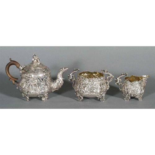 REGENCY STERLING TEA SET Edward Farrell, London 1823/24 decorate with scenes after David Teniers, with gilt interiors CONDITION REPORT: a few very minor pings to bottom of sugar, can't guarantee tea pot handle is original, otherwise excellent- superior quality. PACKING AND SHIPPING: We offer packing (double boxed in most cases) and shipping of this item within the Continental United States by USPS or UPS (our choice- boxes over 30lbs or oversized may be recalculated based on buyer's location), NOT INCLUDING INSURANCE (it will be added when we know the sales price) for $50
