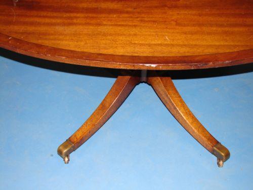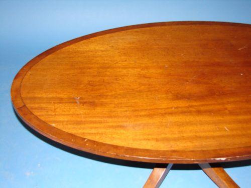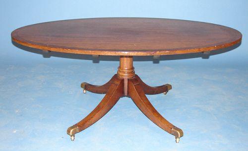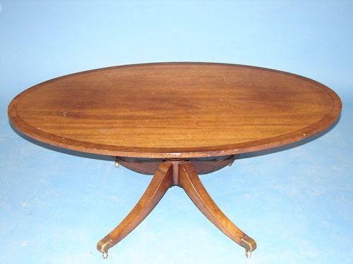 REGENCY STYLE MAHOGANY OVAL COFFEE TABLE. Brass cuffs & castors. Banded inlay at top. Shows surface scratching at top. 19” H, 48.5” L
