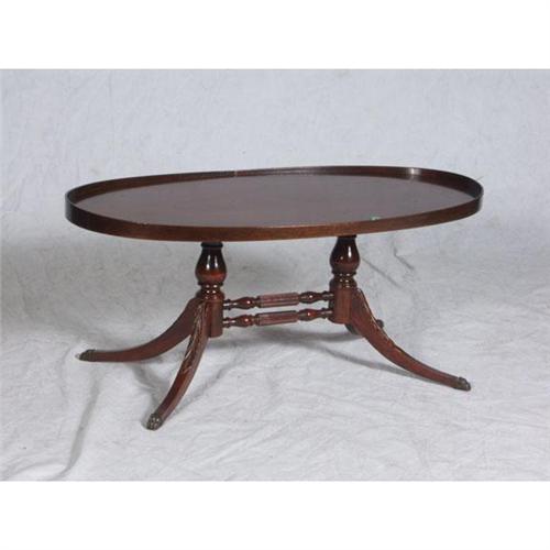 COFFEE TABLE: Regency style mahogany tray top coffee table, oval top above two baluster turned columns with carved downswept legs joined by turned and reeded stretchers. 16''h x 20''d x 38''w