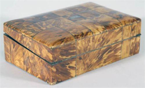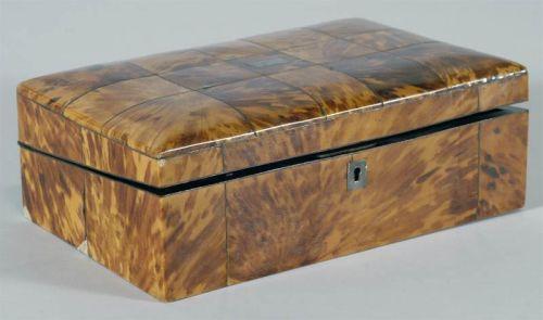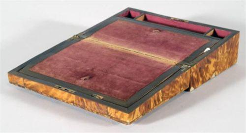 REGENCY TORTOISE SHELL LAP DESK 12 1/2"x8"x4" early 19th century, CONDITION: missing lock, some cracks and lifting, 2" strip of veneer loss at left base, warp to inside flap keeps it from closing all the way, PACKING AND SHIPPING BY FAIRFIELD AUCTION WITHIN CONTINENTAL USA (excluding insurance) $35,