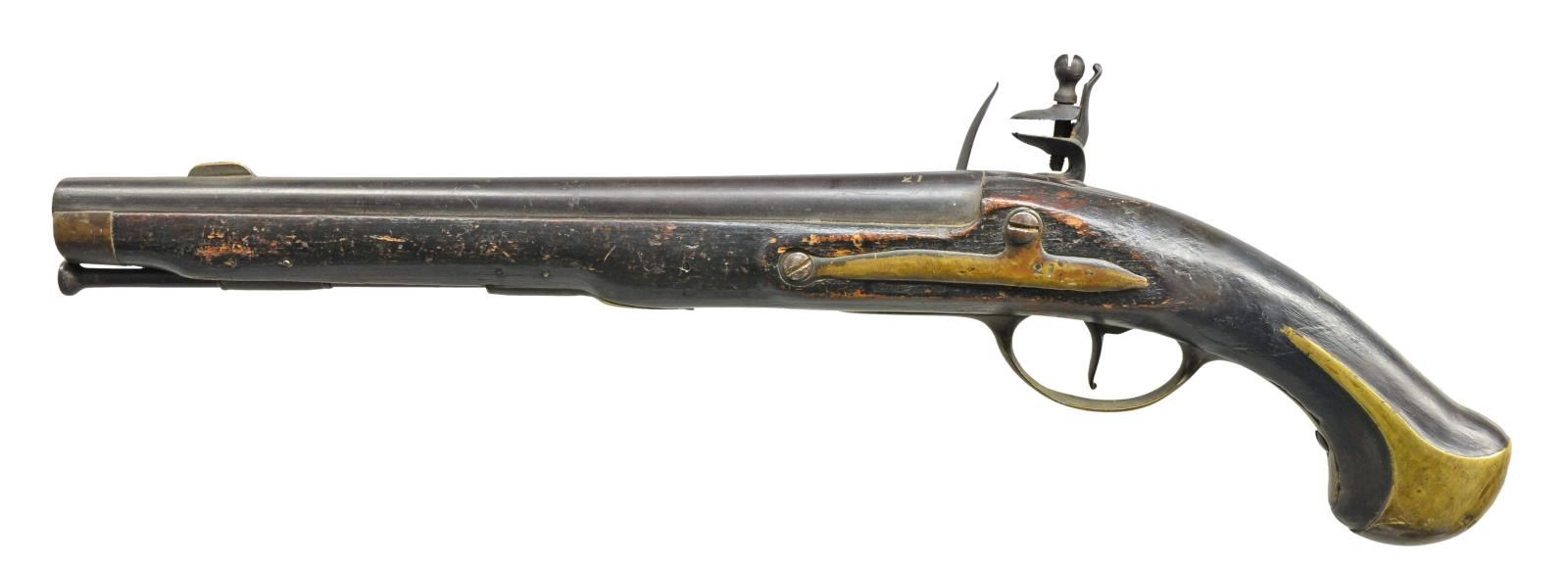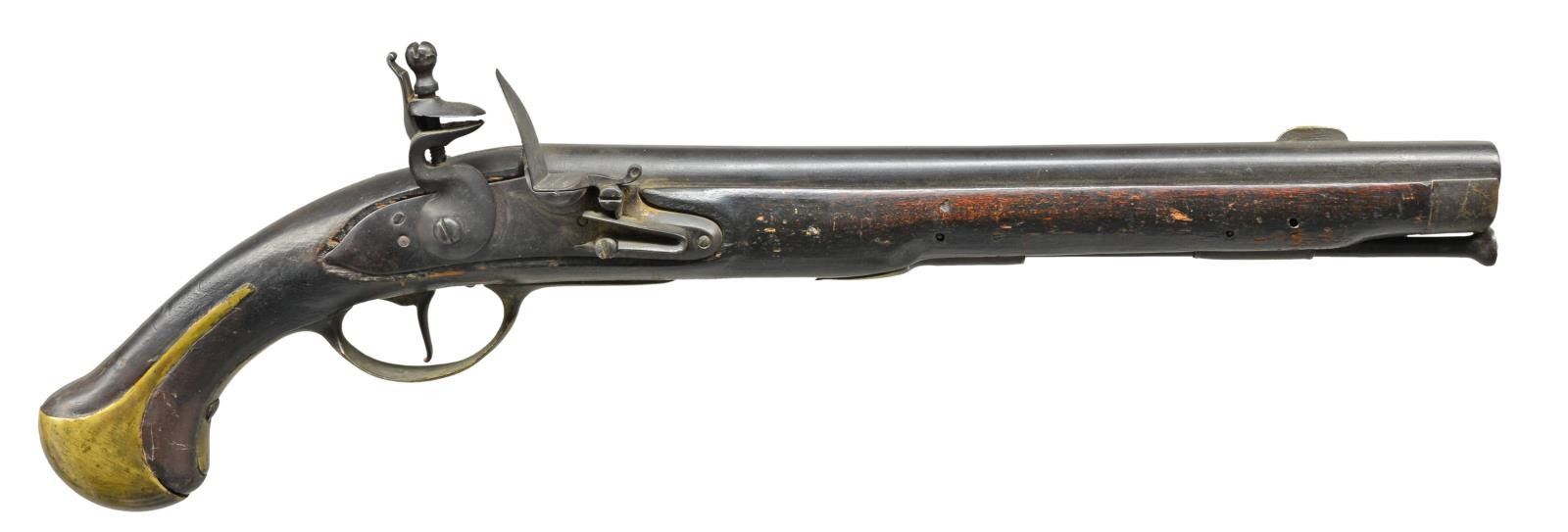 HEAVY DRAGOON PISTOL. Cal. 69. S# 57-21. Bbl. 13" tapered rnd., has lg. brass barley corn type front sight. Stamped w/ an unreadable proof at rear along w/ "21". Tang marked "NT 57". Lock w/ rnd. bodied arched plate has heavy rnd. bodied serpentine cock, inset rounded pan, unbridled friction frizzen & feather spring w/ sm. pointed finial. Lock unmarked inside & out. Hardwood stock extends to muzzle w/ brass cap & is pinned to bbl. Brass furniture includes grip cap w/ long spurs, plain trigger guard, rudimentary sideplate also stamped "21" & single beaded ramrod pipe w/ matching thimble. A steel ramrod w/ trumpet head is present. CONDITION: good, iron parts w/ what appears to be old black lacquer finish. This finish also appears to have been applied to stock & has areas worn through. Brass has hand worn highlights, but is mostly dark brown. There is evidence of major repairs to stock at butt. Mechanically good. All lock parts appear to be original. PROVENANCE: The Estate Collection of Gary Parietti. (01-19058/MGM). ANTIQUE. $2,000-3,000.