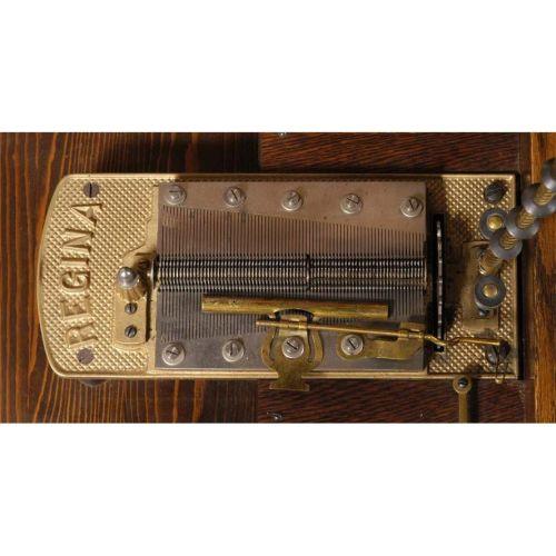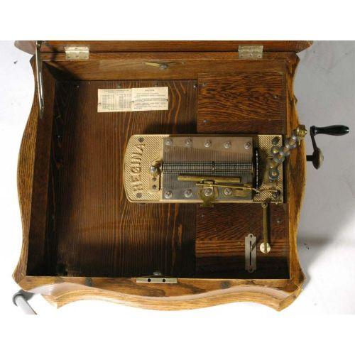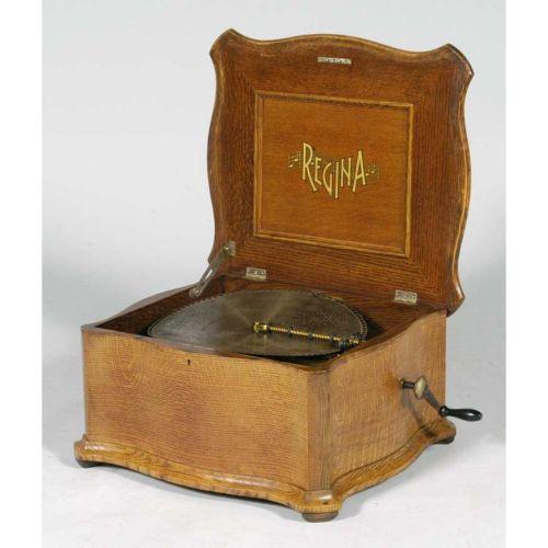 REGINA STYLE 50 DISK MUSIC BOX, with serpentine oak case, together with 22 disks and an associated Victorian stand, circa 1900, CONDITION REPORT: exterior of case refinished, mechanically superb and very clean, one of the best disk machines We've heard- ever!