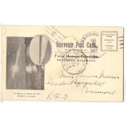 REHOBOTH BEACH, DELAWARE POSTCARD. Titled "The Light House on the Breakwater". Marked on reverse "Souvenir Post Card from Horn's Pavilion-Rehoboth, Delaware". 1907 postmark.