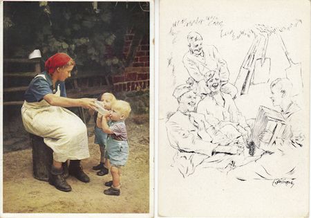Good lot of seven postal covers bearing seven different handstamps from Reichsarbeitsdienst camps in Germany, all postally used, with seven propaganda postcards depicting happy workers, men toiling in the fields, mothers with children, cooperative work with the Wehrmacht, etc. Overall very good.