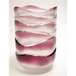 farbloses Glas mit partiellen violetten Überfängen. Hohe, zum Stand gerundete Becherform, Mündungsrand gewellt. Wandung mit umlaufendem tiefem Keilschliff-Dekor in Form von fünf übereinander liegenden, polierten Wellenlinien. Wandungsoberfläche mit feinem Mattschnitt überarbeitet. H.: 22,3 cm. Unbezeichnet. 1950er Jahre