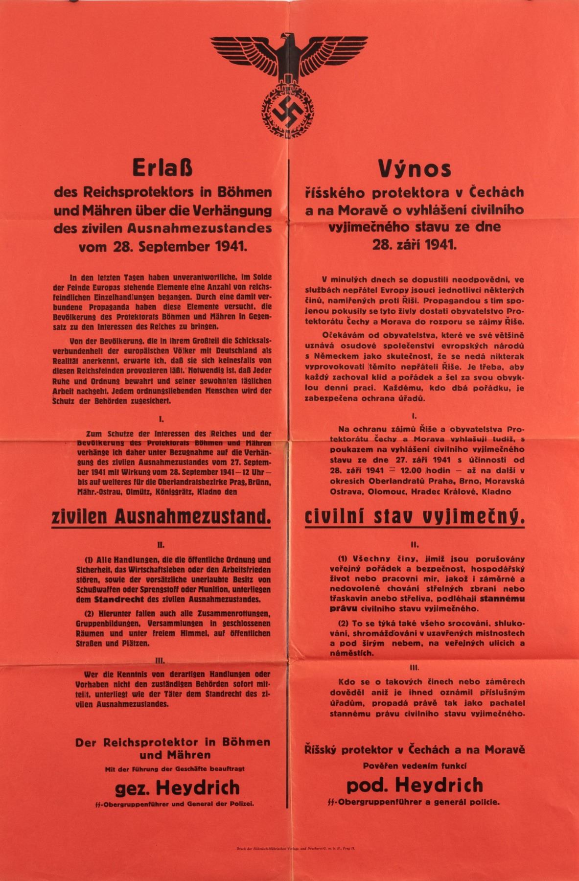 German broadside announcing a civillian state of emergency on 28. September 1941 by the Protectorate of Bohemia and Moravia. In part: 'In the last few days, certain elements who are paid by the enemy of Europe carried out a number of actions against the Reich. These elements have attempted to sway the population of Bohemia and Moravia against the interests of the Reich via propaganda associated with these actions. I expect from the population that ... under no circumstances, will they allow being provoked by the enemies of the Reich ...'. The poster is printed on red paper in German and Czech, approx. 37.25 x 24.75 inches. Signed in print by Reinhard Heydrich (1904 - 1942), Nazi Deputy Protector of Bohemia and Moravia and the main architect of the Holocaust. Mailing folds.