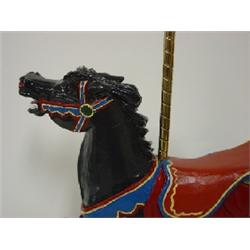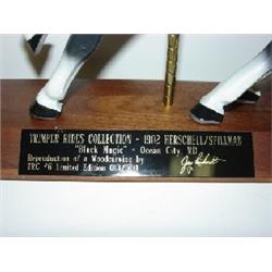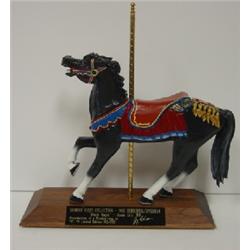 TRIMPER RIDES COLLECTION-1902 HERSCHELL/SPILLMAN MINIATURE WOODCARVING OF CAROUSEL HORSE. Black Magic-Ocean City, Maryland. Reproduction of a woodcarving by Jerry Reinhardt. TRC #6 Limited Edition 013/500. Marked with plate at base. 11.25” H