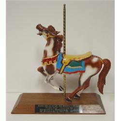 TRIMPER RIDES COLLECTION-1902 HERSCHELL/SPILLMAN MINIATURE WOODCARVING OF CAROUSEL HORSE. Thunder Cloud-Ocean City, Maryland. Reproduction of a woodcarving by Jerry Reinhardt. TRC #1 Limited Edition 045/500. Marked with plate at base. 11.5” H