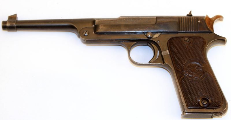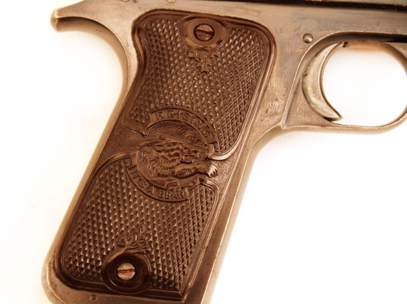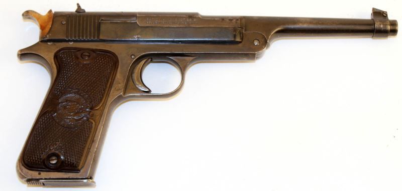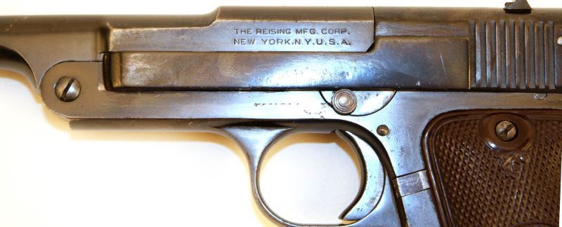Reising .22 caliber target pistol. Bore is bright, bluing is about 75%, with a few minor pitted spots and thinning, and grips are very good. Overall good condition. Caliber: .22 LR Serial #: 10834