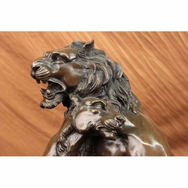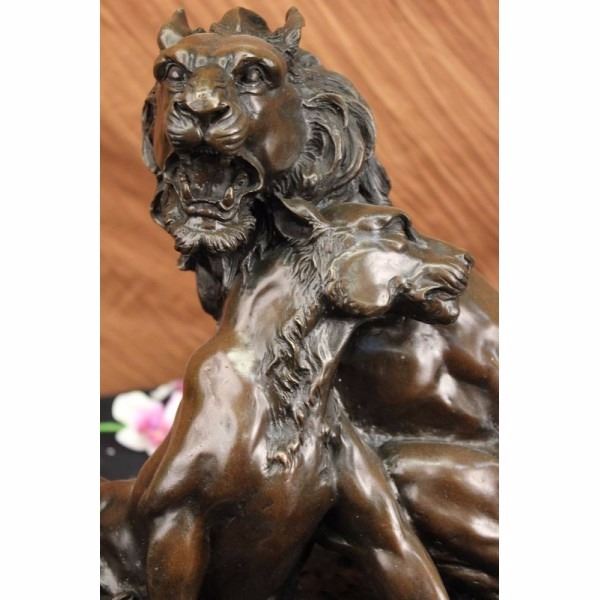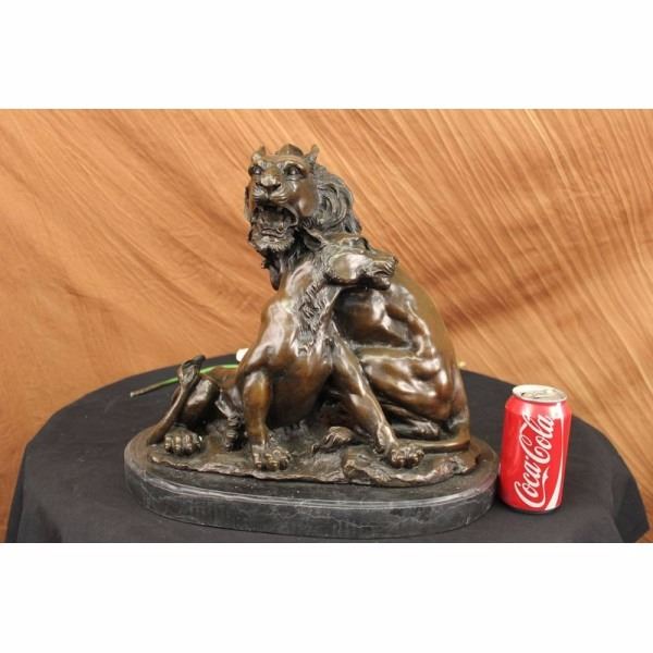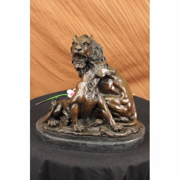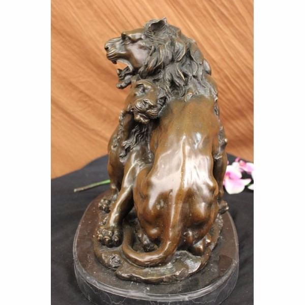 Wild and in love this King of the Jungle shares a bond with his son that nothing can come in between. They rub necks and show massive affection towards each other. They are united together trough love and strength it even looks as if they are molded into each other. You can see the young lion is growing his mane in. The two lions watch out for each other, living in the wild can be a dangerous place, thats why they stick together like a true family should. This bronze sculpture is perfect for Fathers day or just to show your appreciation to your family. This is a gorgeous bronze sculpture it is handmade and 100% bronze with a brown patina. The sculpture was casted using the Lost Wax Method and is mounted on a black marble base. Condition: This sculpture is in a very Good condition. Bronze Dimensions with Marble Base:Height 16" x Width 16" Marble Dimensions: Diameter 16" Height without base: 15" Weight : 45 LBS Inventory : 18Y56012881