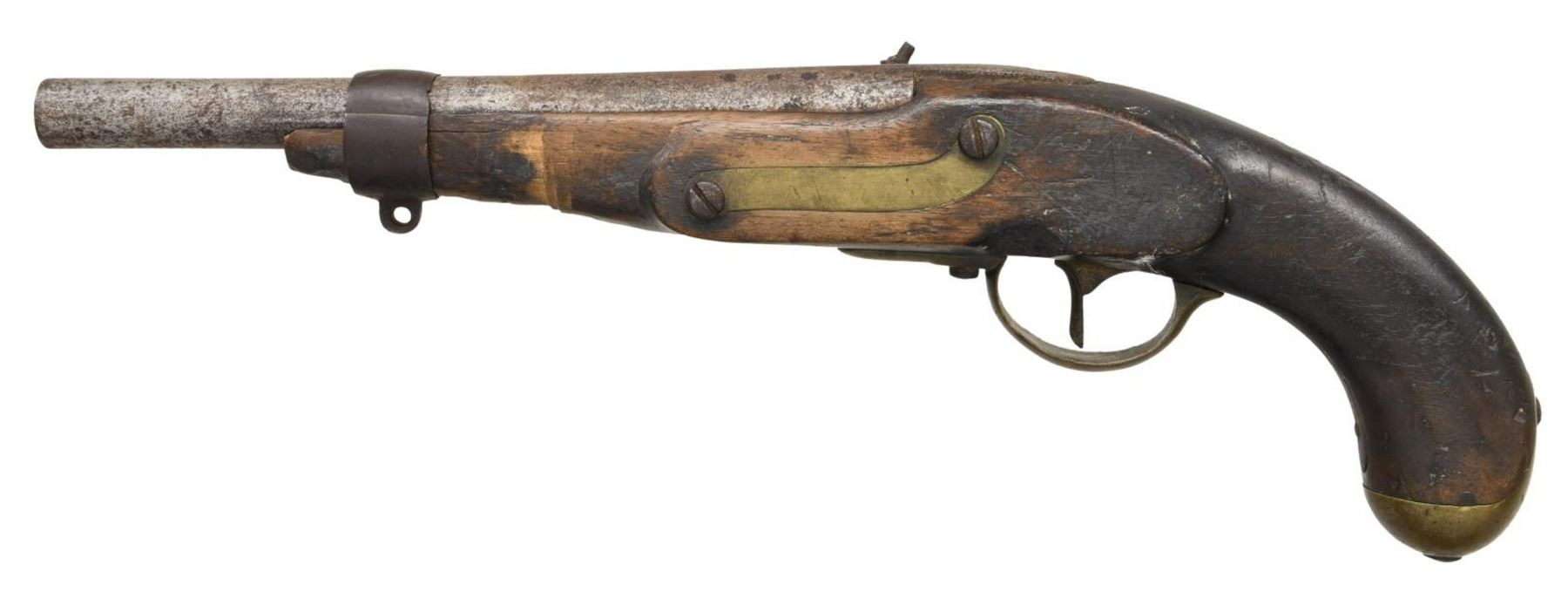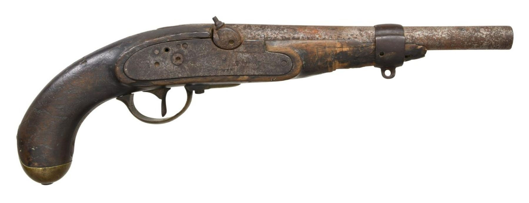 Cal. 58. NSN. 9 7/8". Lockplate is stamped "TOWER" in the center, with a faint crown visible at the rear. Pistol has been converted to percussion. Hammer is not present. Wood stock has been crudely shaved down at the end to accommodate a non-original barrel band. Wood stock with brass trigger guard, pommel, and sideplate. CONDITION: metal components exhibit oxidation and pitting overall, with most markings being partially legible. Brass components exhibit a brown patina overall. Stock shows some cracks and scattered marks from handling and storage. (01-24140/MLW). ANTIQUE. $200-300.