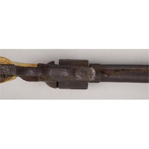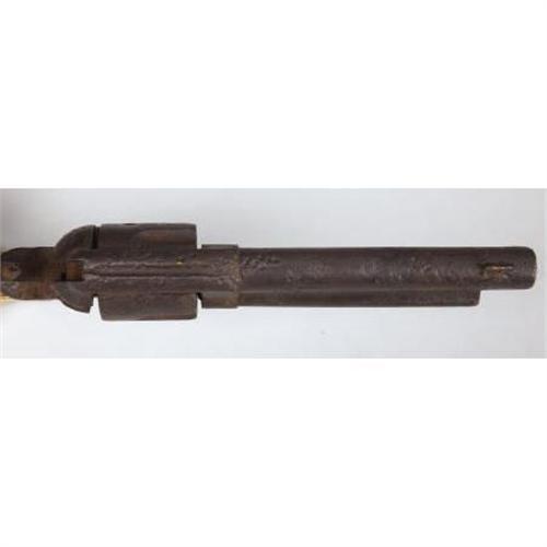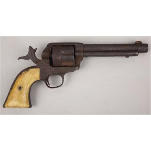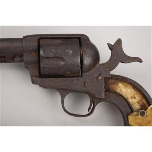 <B>RELIC COLT SINGLE ACTION REVOLVER</B></I> - No visible serial numbers, circa- black powder era. 5 ½” barrel in .45 calibre. No visible factory marking legible, but all features on revolver are standard for this model. Non-functioning action with ivory grips.<BR><BR><B>Condition:</B></I>All metal surfaces heavily pitted with a uniform black color. Hammer is frozen in full cocked position. One spent empty cartridge is present in one chamber. One of the well worn and wonderfully patinated ivory grips on the right side of the revolver is intact. The ivory grip on the left side is only about forty percent intact.<BR><BR><b>Shipping:</b> Bats, Clubs, Sticks, Swords, Rif (<a target="_blank" href="http://www.heritageauctions.com/common/shipping.php">view shipping information</a>)