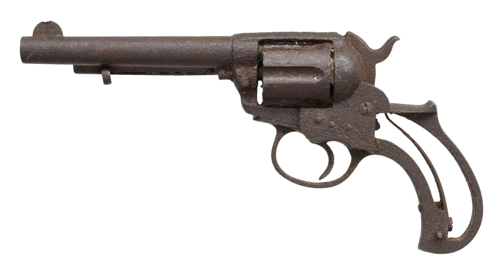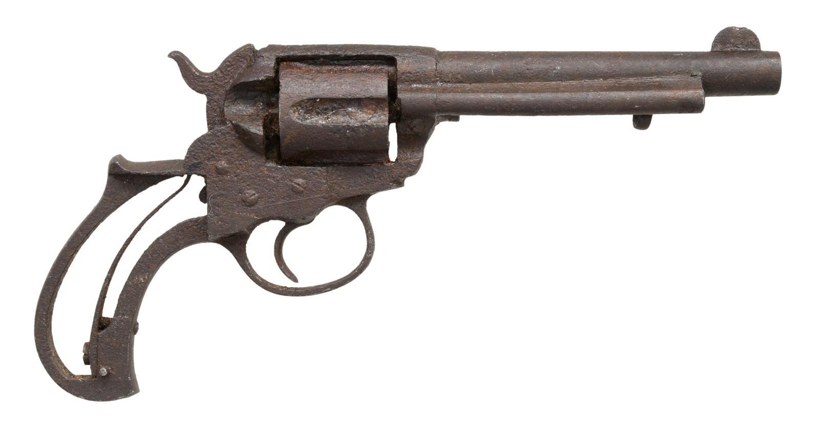 Cal. .38 Colt. S# NSN. Bbl 5". Colt Model 1877 DA revolver in ground dug condition. Grips are not present. Front sight bears a ding. Serial number is indiscernible. CONDITION: as found, with dark brown pitting overall. PROVENANCE: From the Lifelong Collection of Glen E. Mattox. (01-22602/MLW). ANTIQUE. $300-400.