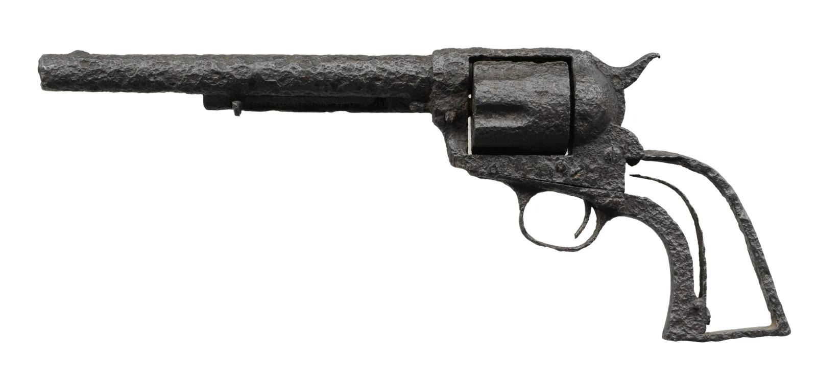 REVOLVER. Cal. .32-20 W.C.F. S# NSN. Bbl 7 1/2". Excavated Colt Single Action Army revolver. Ejector rod housing still retains its original spring. Left side of frame bears an old sticker that is marked "SPDD/ LNDX" in pen. CONDITION: as found, with metal components exhibiting dark pitting and oxidation overall. PROVENANCE: From the Lifelong Collection of Glen E. Mattox. (01-22589/MLW). $300-400.