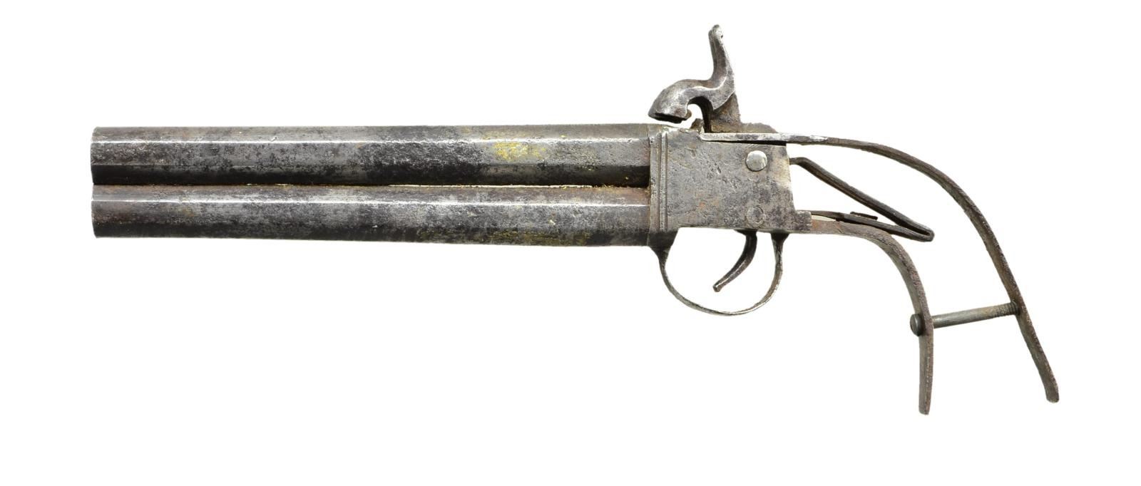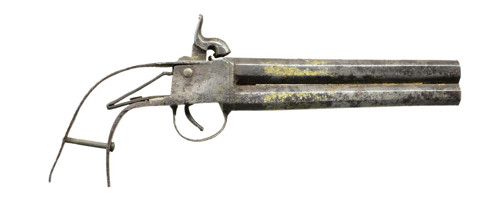 PISTOL. Cal. 45. NSN. The 7" bbls. are octagonal & unmarked. Boxlock frame has center on hammers, most of grip is missing, two pieces remain. CONDITION: poor. Metal showing cleaning over very deep pitting. Remnants of grips are dry. Mechanically inoperable. Nipples missing. (01-21184/MGM). ANTIQUE. $50-100.
