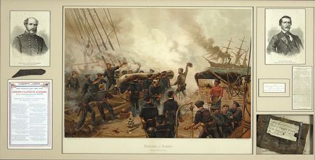 A fine trio of items related to the decisive Civil War battle between the Union sloop of war Kearsarge commanded by John A. Winslow, and CSS commerce raider Alabama commanded by Raphael A. Semmes. On June 14, 1864, the Kearsarge found the Alabama in port at Cherbourg, France where she was undergoing repair. The feared ship, which had captured or burned no less than 65 Union vessels, then made for open waters. Semmes challenged the commander of the Kearsarge to a battle and, five days later, the two ships met in neutral waters. The Confederates opened fire, and although the two vessels circled each other for a short spell, the Alabama soon lost grip of the battle, as its powder and ammunition were compromised due to long storage in unfavorable conditions. The Kearsarge, on the other hand, had been fortified with additional chain cable in critical areas and thus withstood the Alabama's 32-pounder shells. Responding in kind, she bombarded the Alabama with 11-inch Dahlgren smoothbore pivot cannons, decimating the vessel. Semmes surrendered and dispatched a boat with a message for help. Much to Winslow's disappointment, he himself was saved aboard the Deerhound, and made for England with 41 surviving sailors. Our fine lot comprises a relic from the Kearsarge, a 6" x 4" portion of a plank removed from the vessel. The plank is bound with strips of metal (iron?), and bears upon it a period note reading: "Taken from a damaged plank of the U. S. ship Kearsarge on her return after sinking the Alabama". This relic is spectacularly matted with signatures of the captains of each ship, RAPHAEL A. SEMMES, signature on a small card reading: "Raphael A. Semmes Rear Admiral late C. S. Navy". With a signature of JOHN A. WINSLOW penned on a dark brown sheet, irregularly trimmed. Presented around a 21 1/2" x 15" chromolithograph (copyright 1887 by Prang & Co. of Boston) entitled "Kearsarge and Alabama". Along with the signatures is a vintage sheet bearing the song Liberty and Union forever, New Patriotic and Comic Song on the Sinking of the Pirate Alabama by the U.S. Gunboat Kearsarge...", printed in red and blue on an octavo sheet. Portrait engravings of Winslow and Semmes are also presented. The assemblage is handsomely matted in cream and set into a huge wood frame. Fine condition, surely a great display item for the Civil War naval collector.