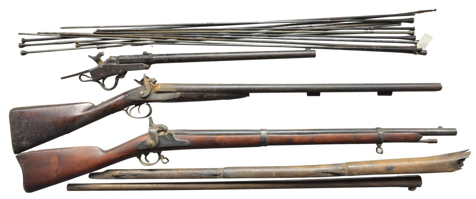1) S. SUTHERLAND PERCUSSION SXS SHOTGUN. Cal. 12 Ga. NSN. Bbls. 28" of twist steel. Top flat is gold marked "LONDON" & has gold bands at breech end. Right lock marked "S. SUTHERLAND", left lock marked "RICHMOND VIRG". Key fastened straight grip checkered walnut stock w/ steel shotgun buttplate. Consignor supplied information states that Sutherland was under contract w/ the Confederacy to convert flintlock rifles to percussion during the Civil War. CONDITION: bbl. & locks have dark rusty appearance w/ light appearance. Locks do not function. Stock is broken at head & shows heavy wear. Trigger guard is broken at front attachment screw. Ramrod is missing. Dark pitted bores. (01-18696/DS). ANTIQUE. 2) MAYNARD BREECHLOADING PERCUSSION CARBINE. Cal. 50. NSN. Bbl. 20" w/ blade front sight & single leaf rear sight. Left side of action has replacement saddle ring & bar w/out screw. Semi inletted replacement stock has not been fitted to the gun. Repro. buttplate. Repro. mainspring, nipple & 2 buttplate screws. CONDITION: metal has dark rusty pitted appearance. Trigger guard tang is not present. Top tang is broken through screw hole. Action is not functioning. Rusty bore. (01-18697/DS). ANTIQUE. 3) ASSEMBLED PARADE OR TRAINING MUSKET. 1864 Dated Springfield Lock & Model 1863 stock cut to 2 band length. Bbl. utilizes breech & muzzle section of original bbl. on either end of 19 1/2" wood dowel. CONDITION: functioning lock shows faded blue w/ surface rust on hammer. Stock shows scattered handling marks. 18 RAMRODS. Consisting of 5 w/ tulip tips. 1 Is labeled for a Richmond confederate carbine. / 3 Trumpet tips. / 4 Slotted tips. / 6 Assorted button tips. 1 Is identified for a Mendenhall, Jones & Gardner. / LONGARMS PARTS. 37" Bbl. w/ 2 leaf rear sight & hammer for a Model 1861 US Rifle-Musket. Partially polished w/ pitted bore. / 37" Bbl. only for for 1863 rifle musket. Dark appearance w/ general pitting having a rusted bore. / Forearm section from a European 3 band musket. / All items housed in wooden barrel. (02-14511/DS). $300-500.