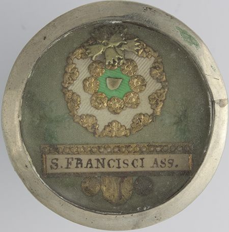 First class relic of St. Francis of Assissi (1182-1226), the founder of the Franciscan Order and one of the most venerated religious figures in history. The relic is encased within a 1 1/2" dia. reliquary with St. Francis attribution, green and white cloth, and small gold decorations. Also present is the original church certificate authenticating the relic, signed by Father Martinus of the Monastery at Westermallensis, Jan. 7, 1857. Very good.