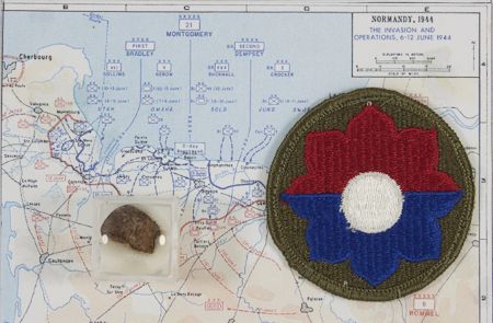 Attractive 6 1/2" x 4 3/4" shadowbox display containing a "spent" .38 pistol bullet in small plastic cases attached to a reproduction of a military map of the landing beaches. The map has also been adorned with a shoulder patch of an American regiment participating in the landing. Accompanied by 1985 photos of the consignor's children at the Normandy beaches and battle site, along with his letter of provenance. The consignor, a disabled American vet, has pledged a share of the proceeds of this display to paralyzed veterans in Washington State.