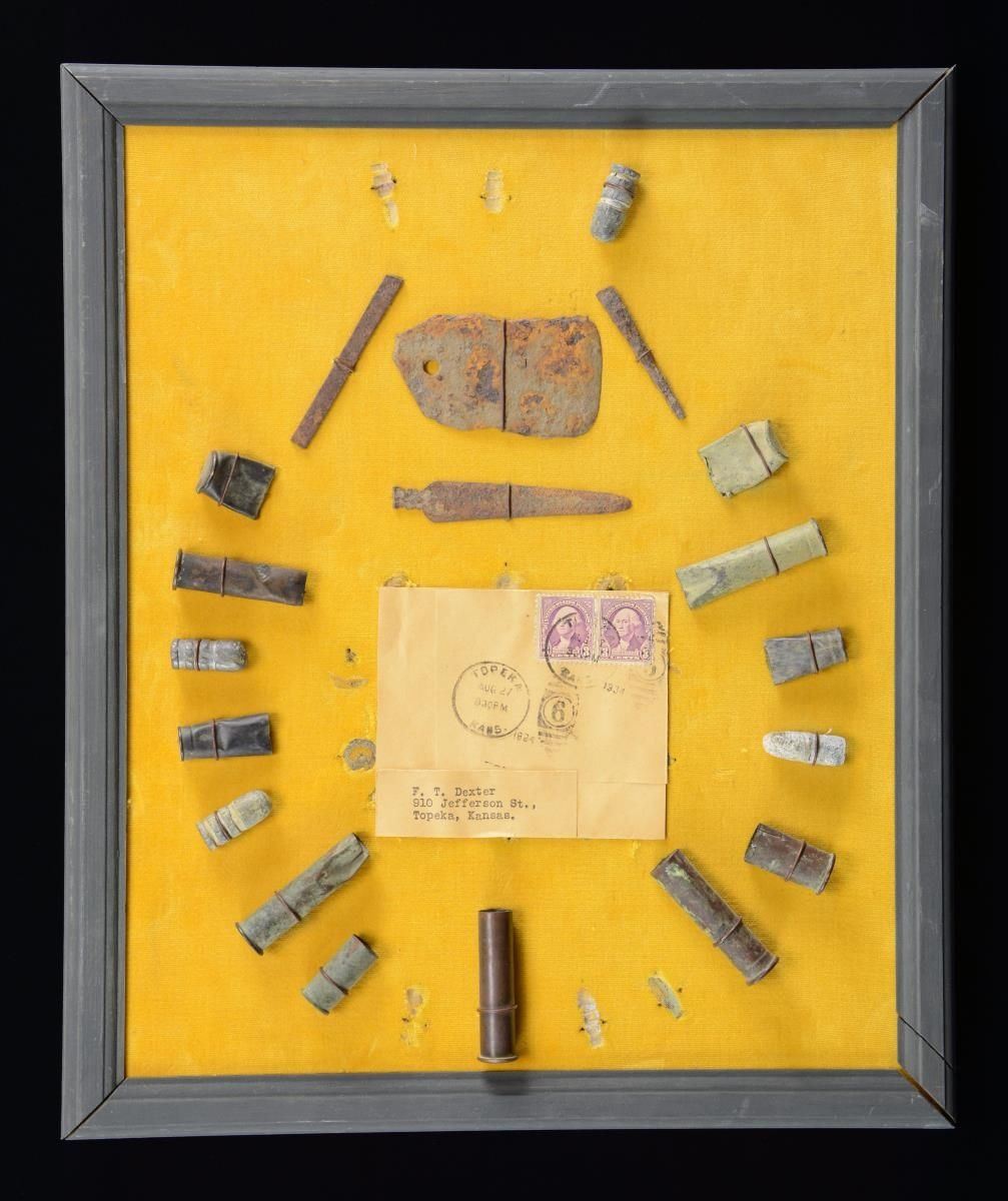 HORN BATTLEFIELD. 15" x 12" frame with 18 bullets, casings, arrow head with Theodore Dexter portion of envelope dated Aug. 27, 1934. Dexter was prominent dealer of the 1930s and these relics are listed in one of those catalogs. CONDITION: originally had more relics mounted, missing now. PROVENANCE: Martin Lane Historic & Western Americana Lifetime Collection. (02-21655/JS). $1,000-2,000.