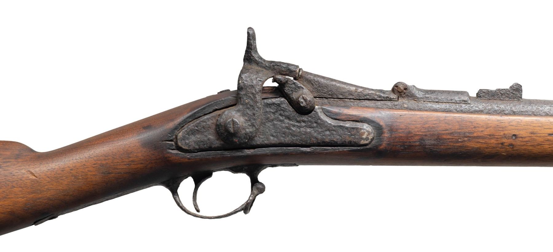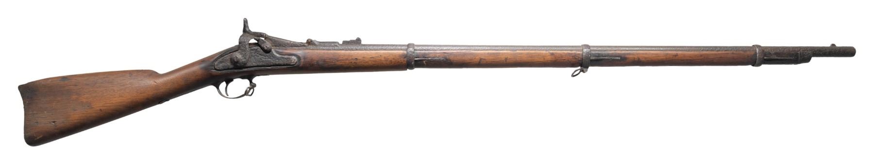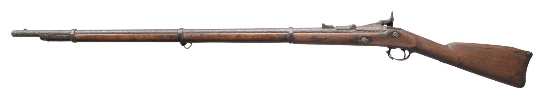 RIFLE. Cal. 50-70. S# Unknown. Bbl. 36 5/8". Mfg. 1866 as Allin conversion of Model 1863 percussion musket utilizing brazed in barrel liner. Distinctive triple barrel band (with springs) stock retaining original 1863 flip up sight. Normally (no visible markings) with "1866" over American eagle on breech block having Civil War lock with Springfield markings to include 1863 or 1864 date. Often referred to as Second Model Allin Trapdoor; only 25,000 made. CONDITION: very poor cleaned condition with extensive corrosion having a wrought iron appearance. Battlefield abandoned due to failure of its ammo as it had a fired casing and bullet stuck in its bore. Rod was used to penetrate the obstruction and eject the casing. Light can be seen through the bore. Not salvageable for use, but would make a great "wall hanger" (suitable for decoration only). Hammer will move and breech block will open, but will not cock and firing pin is rusted into a protruding position. Prior attempt was made to loosen the lock mounting screws and enhance their slots (to no avail). Chip in stock by left side of tang plus missing buttplate assembly. (01-27360/NW). ANTIQUE. $150-300.