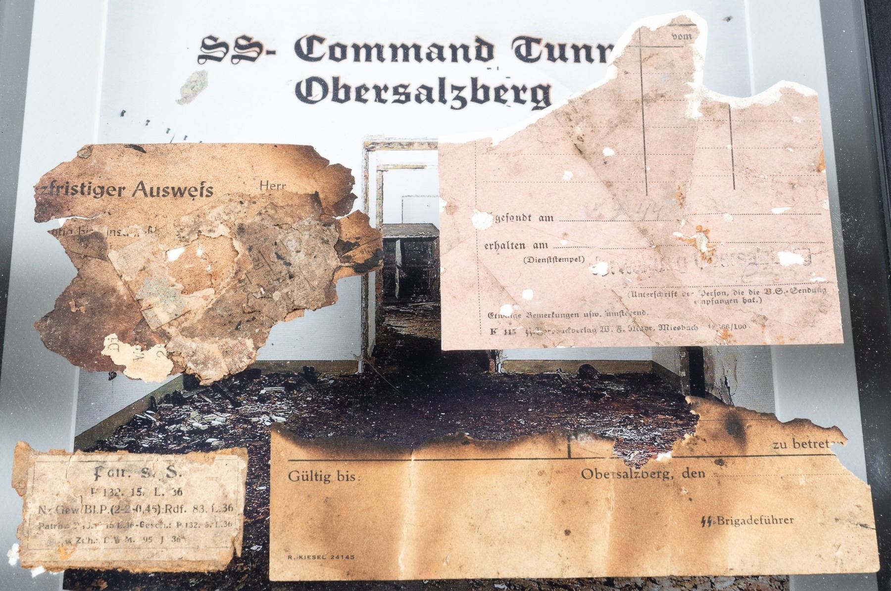 Four historical relics recovered by a local resident from the bunkers of Adolf Hitler's mountain retreat the Berghof at Obersalzberg. The relics are fragments of German SS documents left in the bunkers at the Berghof and once thought to be destroyed. The relics are partial documents and one is titled 'Temporary ID', the other is an issuing document with faint inscriptions and signatures. The included provenance reads, 'The document fragments were found in the Obersalzberg command tunnel during the filming of a documentary film about the bunker facilities on Obersalzberg in 1989...In the command tunnel especially in the Flakmeldezentrale we found...numerous fragments of old SS identity cards and driving permits.' The relics are mounted inside of a 10.5 x 10.5 shadow box with an interior picture of the SS-Command Tunnel. The documents have been carefully placed between two pieces of plexiglass in the shadow box. Accompanied by a letter of provenance.