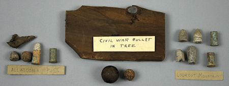 A nice grouping of relics from the two historic battles: a group of four minie balls and a bullet casing with period note identifying them as being from Lookout Mountain, along with five relics identified as from Allatoona battlefield: two minie balls, a bullet and casing and piece of wood. Also contains two large pieces ball shot and a piece of wood with bullet buried within, also accompanied by a separate note reading: "From battlefield 'Allatoona Pass' Ga. [Ga]thered in December 1901". Very good.