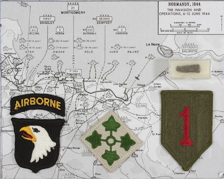 Attractive 9" X 11" shadowbox display containing a "spent" rifle round in a small plastic case attached to a reproduction of a military map of the landing beaches. The map has also been adorned with three shoulder patches of Ameican regiments which participating in the landings. Accompanied by 1985 photos of the consignor's children at the Normandy beaches and battle site, along with his letter of provenance. The consignor, a disabled American vet, has pledged a share of the proceeds of this display to paralyzed veterans in Washington State.