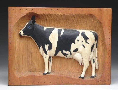 RELIEF CARVING OF BLACK AND WHITE COW. Rectangular block of wood is relief carving of cow. 20th Century. Signed “A. Coursol”. Nicely done. SIZE: 12-3/4” x 17”. CONDITION: Very good. 9-27007